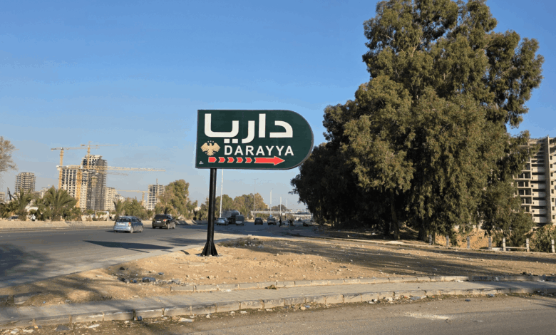 عند الدخول إلى مدينة داريا في غوطة دمشق الغربية، يجد الزائر تفاصيل خاصة: لافتات ترحيبية بالزوار، وأخرى تدعو إلى العلم والعمل والبناء، وثالثة تقول «الواجب أولاً والقيام به يحفظ الحقوق»، وأخرى تُحيِّي الشهداء الذين سقطوا خلال سنوات الثورة والحرب.